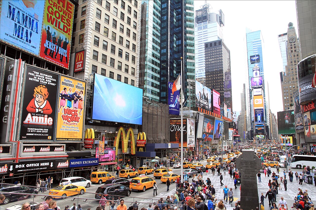 A Times Square, em Nova York, é conhecida mundialmente pelos telões gigantes, luzes intensas e fluxo constante de pessoas, funcionando até como um dos principais cartões-postais dos EUA. Justamente por isso, o modelo virou referência para cidades que buscam revitalização urbana e ativação econômica.